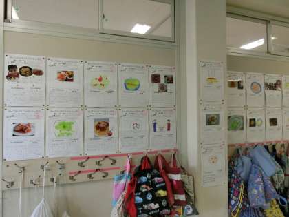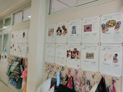 2年生の夏休みの宿題の一つに、1学期に育ててきたミニトマトを使った料理のレポート作成がありました。2学期になり、料理のレポートが廊下に掲示されています。サラダをはじめ、ミネストローネスープ、スパゲッティ、ピザ、そうめん、肉巻きなど様々な料理が紹介されていて、そのレシピの豊富さに驚きました。