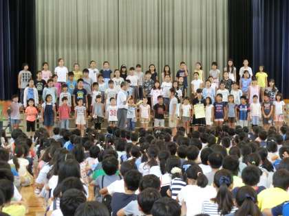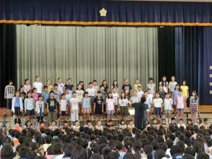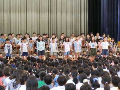 8日(木)の音楽朝会は合唱団の発表でした。最初に、NHK全国学校音楽コンクール東京都コンクールの表彰を行いました。予選会での金賞授賞と本選での優良賞授賞の2つの賞状が代表の6年生に手渡されました。その後、自由曲で披露した曲と6年生8名による重唱の演奏がありました。美しい歌声が聞いている子どもたちみんなを魅了していました。