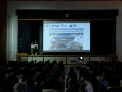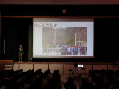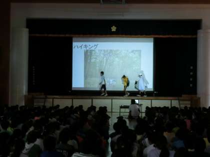 12日(月)の全校朝会は、6年生による「日光林間学園報告会」が行われました。9月になってからの準備でしたが、短期間でも6年生は報告会に向け、様々なアイディアを出して取り組んできました。全校のみんなに楽しんでもらうために寸劇を入れるなど工夫もあり、報告会から、6年生が楽しい時間を過ごしてきたことが伝わりました。