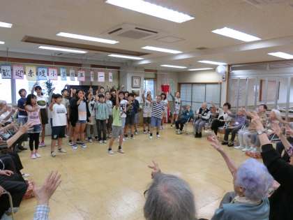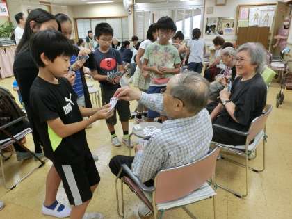 5日(水)、5年1組の子どもたちが、「デイホーム赤堤」を訪問させていただきました。16名の方々が子どもたちを温かく迎えてくださいました。挨拶のあと、グループごとにそれぞれの遊びをしたり、全員でじゃんけんゲームをしたりしてとても盛り上がりました。最後は、子どもたちが「ふるさと」と「まっかな秋」の歌を歌いました。「ふるさと」の歌は、参加された方も自然に歌の輪に入り、一緒に楽しむことができました。子どもたちの姿に「また来てね。」「今日はありがとう。」「とても楽しかったよ。」と涙を流される方もいました。