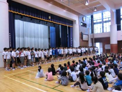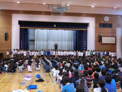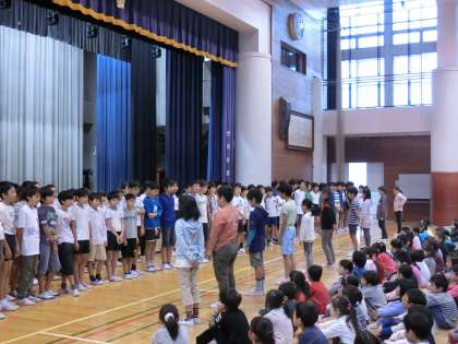 17日(月)の全校朝会は、18日に行われる「連合運動会」に参加する6年生を全校の子どもたちで応援しました。校長先生から連合運動会についての話があり、その後5年生が先頭に立ち、大きな声で応援をし、その声に続いて子どもたちが声を出していました。エールを送られた6年生からは「力いっぱい頑張ってきます。」と決意の言葉が述べられました。
