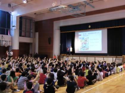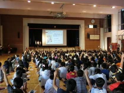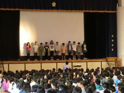 20日(木)の朝、体育館で「図書委員会」の発表がありました。図書室にある新刊本や図鑑の中からクイズを出す「クイズ de 本」の取り組みについての説明や給食の献立とコラボレーションした本の紹介などをクイズにして出題しました。給食番長が作ったメニューについての問題は全員が「カレーライス」と答えることができました。