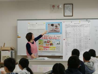 15日(火)と16日(水)の2日間、5年生の家庭科の授業に本校の栄養士が参加しました。「食べて元気に」の学習の中で「給食から栄養を考えよう」と題しての授業でした。栄養士から「食べ物はどんな働きをするのか」について話があり、その後、子どもたちは給食の献立から「あか・きいろ・みどり」に分けて考えました。給食は3色が揃っていることがわかり、残さず食べることが大切だと理解できました。写真は16日の2組の様子です。