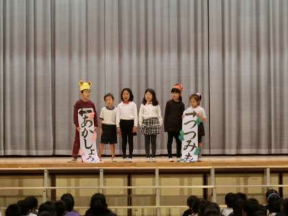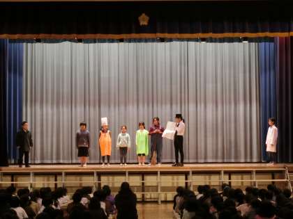 24日(木)の朝、体育館で学習発表会の見どころ集会がありました。プログラム順にステージに登場し、学年の出し物の見どころを紹介しました。限られた時間の中で、全校児童に楽しんでもらおうと宣伝する姿がありました。写真は、1年生、3年生、5年生の様子です。