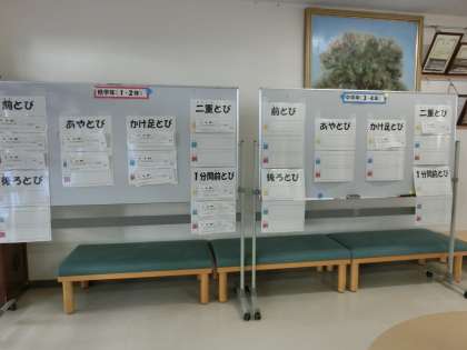 11月4日(金)から始まった「なわとび月間」が12月2日(金)で終了しました。朝のわくわくスポーツタイムで「なわとび」を行い、リズムなわとびに続いて、各自の練習と検定を行いました。なわとび月間の仕上げとして今年度は「なわとびオリンピック」を実施しました。1階のロビーに、低学年用、中学年用、高学年用のホワイトボードを用意し、各とび方の金メダル、銀メダル、銅メダルを張り出しました。とんだ回数ととんだ人の名前をお昼の放送で発表するので、子どもたちの関心も高まりました。