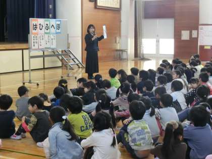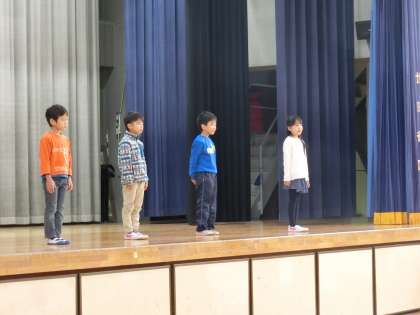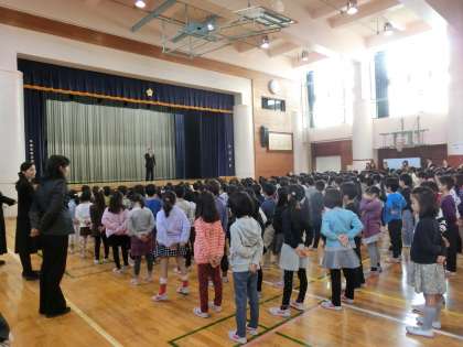 22日(木)で2学期が終わりました。朝、体育館で終業式が行われ、校長先生からはまず、各学年の子どもたちの頑張ったことについてのお話がありました。次に冬休みを前に、「年末年始の日本の習慣を楽しむこと」「家の手伝いをすること」「交通事故に気を付けること」の3点が話されました。児童の言葉は2年生でした。マイクなし、原稿なしで大きな声で、ゆっくりと2学期に頑張ったことを話しました。その立派な態度に聞いている子どもたちもより一層真剣な態度になりました。終業式後に生活指導主任から、冬休みに気を付けてほしい「はひふへほ」の話がありました。