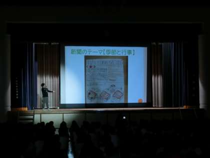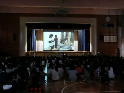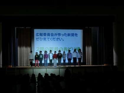 19日(木)の朝、体育館で委員会発表がありました。今回は、広報委員会と放送委員会の発表でした。最初は、広報委員が登場し、壁新聞を作成し校舎2階の踊り場に掲示していることを紹介しました。次に放送委員が「放送委員会の一日」と題したドキュメンタリー風映画を上映して、活動の様子を伝えました。子どもたちは、2つの委員会の工夫ある発表をよく聞いていました。