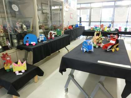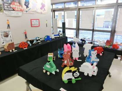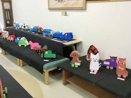 3学期の学校公開期間に合わせて、1階玄関脇ホールに5年生の作品を展示しています。2学期に図画工作の時間に取り組んだ木工作「アドベンチャードライブ」です。木の板を自分のイメージに切り、タイヤを付けたり、色を塗ったりして仕上げました。来校された方々からは「上手ですね。」「かわいい作品です。」と感想をいただきました。