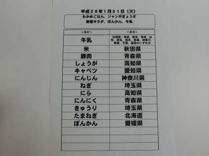 1月31日(火)の給食食材産地について