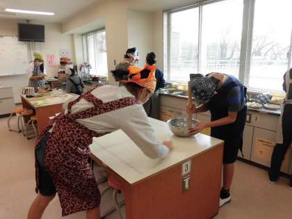 1月30日(月)、6年生は家庭科の授業でジャガイモを使った「いももち」作りに挑戦しました。いつもより人数の少ない中でしたが、協力して実習をしていました。写真は1組の様子です。