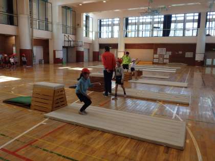 地域のスポーツクラブの先生が2名来校し、3年生に1校時:3組、3校時:1組、4校時:2組に跳び箱運動を教えてくださいました。授業は柔軟体操に始まり、次に跳び箱運動につながる動きの練習、そして最後に、開脚跳び、台上前転を教わりました。今日初めて、開脚跳びや台上前転ができた子がたくさんいました。先生たちも、スポーツクラブの先生方の指導が参考になりました。