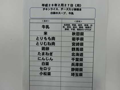 2月27日(月)の給食食材産地について