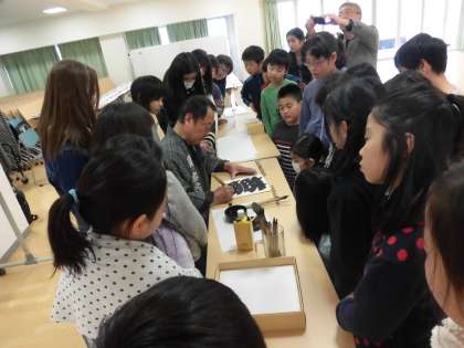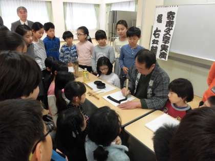 2月27日(月)、多目的室において「寄席文字教室」が行われ、4年生が参加しました。子どもたちは、講師の先生の筆の動きに注目し、文字が完成すると拍手を送っていました。また、先生の筆をお借りして、「十」の字を書きました。子どもたちの注文にも応じてくださり、「美」「恵」「夢」などの文字を書いていただきました。写真は、上から1組、2組、3組の様子です。