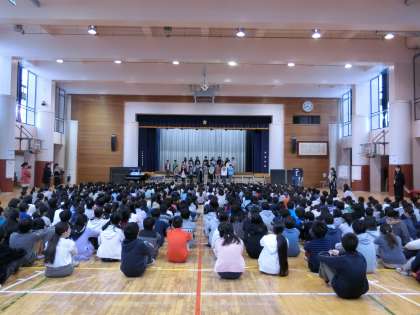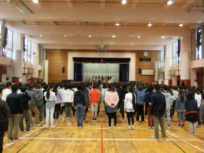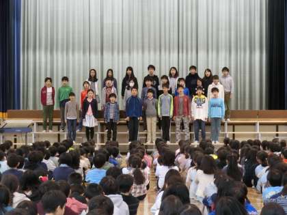 3月2日(木)、体育館で音楽朝会がありました。4日(土)に行われる「学級音楽発表会」で全員が歌う「校歌1番」と今まで練習してきた「U&I」の2曲を歌いました。今回は、6年3組がひな壇に登壇し、手本を示してくれました。さらに4日に披露する「春よ、こい」を先行発表してくれ、完成度の高さを示していました。