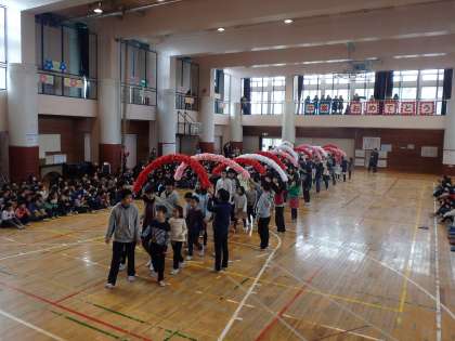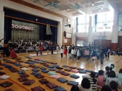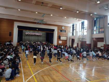 5年・4年の代表委員が司会進行になり、6年生を送る会が開かれました。入場は1年生と手をつないでの入場でした。6年生と別れるとき、1年生が手をふりながら離れていくのが、かわいらしかったです。写真は、入場、1年の出し物「呼びかけと読み聞かせ」、2年の出し物「6年生のいいところベスト3と歌」の様子です。