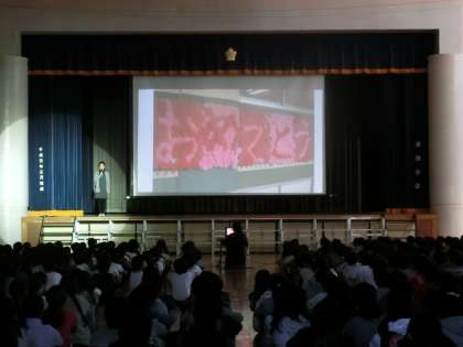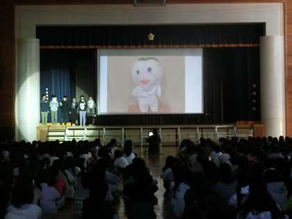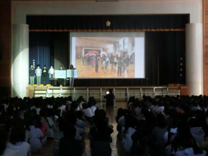 3月9日(木)の朝、体育館で「代表委員会の発表」がありました。月ごとにどのような活動をしてきたのかをスクリーンを使って紹介しました。運動会や学習発表会のスローガン決めをはじめ、学校の開校記念日に合わせて学校の歴史集会を企画したり、学校中にあいさつの輪を広げようとキャラクターを考えたりしてきたことがよくわかりました。