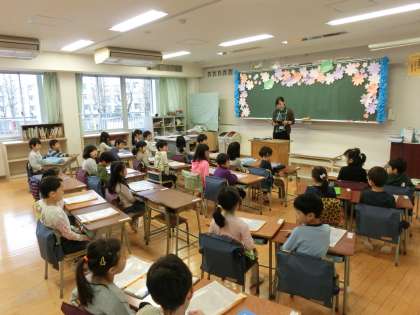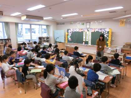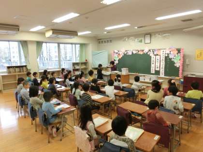 6年生が自分の教室に戻ると、1年生は担任の先生とともに朝の会を始めます。各クラスから「おはようございます。」と大きな声が聞こえてきます。出席をとると「はい」と元気な声が教室に響いていました。提出物の確認をしたり、プリント類を配布したりしながら、朝の時間を過ごしました。