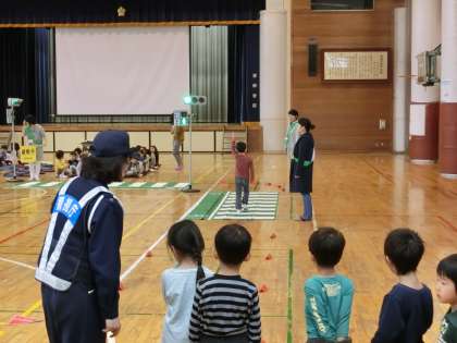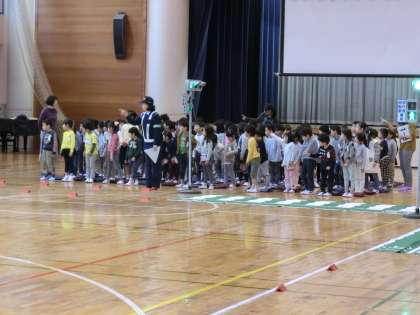 8日(土)の2時間目、1年生は交通安全教室に参加しました。北沢警察署の方にお越しいただき、歩行訓練をしました。雨のため、体育館での訓練となりました。左右の確認を必ずしてから、手を挙げて横断歩道を歩きました。交通安全教室は、PTA役員の皆様と校外委員の皆様にご協力いただきました。ありがとうございました。