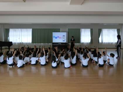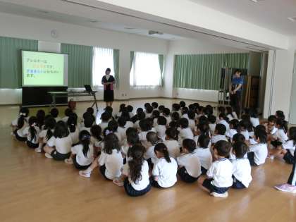 10日(金)の4時間目、1年生は多目的室に移動して「食物アレルギー」についての学習をしました。指導は、養護教諭と栄養士が行いました。パワーポイントを使いながら、食べられないのはアレルギーという病気のためで、好き嫌いとは違うこと、人によって症状が違うこと、学校の給食では配膳を間違えないようにオレンジ色のトレイと黄色の食器で配膳していることなどを学びました。1年生は12日(水)から給食が始まります。食物アレルギーのある子どもたちにも安心して食べてもらえるように気を付けてまいります。