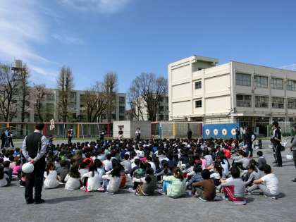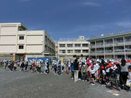 12日(水)、今年度最初の避難訓練を行いました。今回は地震を想定して行いました。机の下に体を入れ、机の脚をしっかり持って揺れが収まるのを待ちました。その後、防災頭巾をかぶって、校庭に避難しました。1年生だけは、ベランダに避難しました。全員の避難が確認できたところで、校長先生のお話を聞きました。避難する姿として、「おさない、かけない、しゃべらない、もどらない」の約束が守れていました。来月は、引き取り訓練を予定しています。
