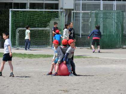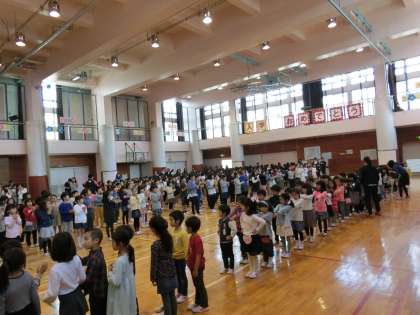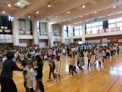 13日(木)の朝、体育館で対面式を行いました。対面式とは、1年生が初めて全校児童の前に出てあいさつをし、仲間に加わるというものです。1年生は上級生に拍手で迎えられ、2列になって並びました。互いに向かい合い、「よろしくお願いします。」とあいさつをしました。その後、集会の列に入り、全校児童が勢ぞろいとなりました。対面式が終わったので、この日の休み時間から1年生も校庭に出て遊ぶことができるようになりました。1年生は赤白帽子を被って校庭で遊びます。早速、友達とボール遊びをしたり、上級生と手をつないで校庭を歩いたりしていました。
