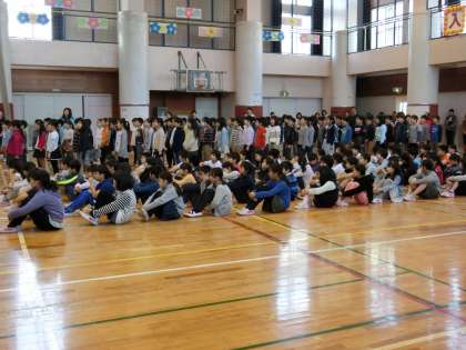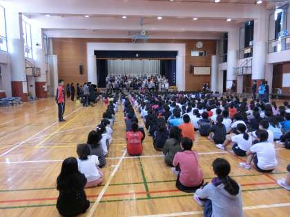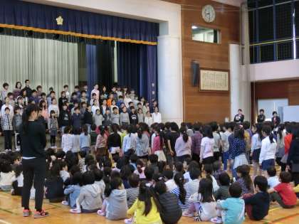 13日(木)、対面式が終わってすぐに今年度最初の「音楽朝会」を行いました。6年生がステージ前のひな壇に立ちました。まず、「翼をください」の歌を披露しました。その後、各学年の子どもたちが昨年度までに覚えた歌をその場に立って歌いました。その各学年の歌を6年生が歌い、聞き比べをしました。2年生は「きらきら星」の英語バージョン、3年生は「チャレンジ」、4年生は「ふじ山」、5年生は「ゆかいに歩けば」の歌です。どの学年も上手に歌うことができました。さらに素晴らしいのは、6年生が1日で4曲を覚え、歌声も美しく、表現力も豊かに歌ったことです。その姿を見た子どもたちからは「6年生はすごいな。」「6年生の歌は上手だな。」と感想が聞かれました。
