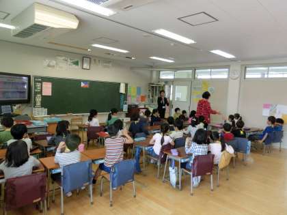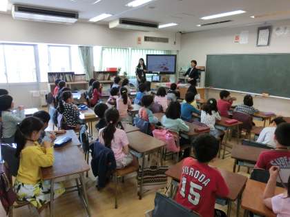 20日(木)からALTによる英語の授業が始まりました。1年生から4年生までがALTと一緒に学びます。今年度は昨年度よりも授業数が増え、1・2年生は7時間、3・4年生は15時間になります。今回は、2年生2クラス、3年生1クラス、4年生1クラスの授業でした。名札を首からかけて、自分の名前を紹介したり、あいさつの仕方を練習したりしました。