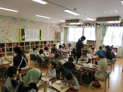 20日(木)、1年生の保護者を対象に「給食参観」が始まりました。27日(木)までの5日間行われます。子どもたちの配膳の様子をご覧いただき、給食を一緒に食べました。12日(水)から始まった1年生の給食ですが、この1週間で配膳の仕方、一人ひとりの準備が上手になってきています。