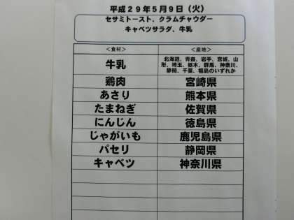 5月9日(火)の給食食材産地について
