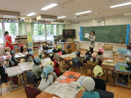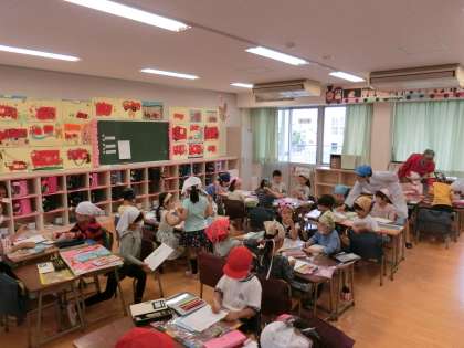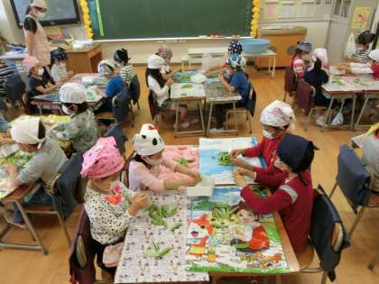 10日(水)の1時間目、1年生は身支度を整えて「グリンピースのさやむき」を行いました。栄養士が3クラスを順番に訪問し、「まめ」の絵本を読んだり、グリンピースの栄養について話をしたりしました。3種類の緑色の豆の中からグリンピースを見分けられたのは全体の約半数でした。給食の「グリンピースご飯」に使われるとあって、1年生は丁寧に丁寧にさやをむいていました。