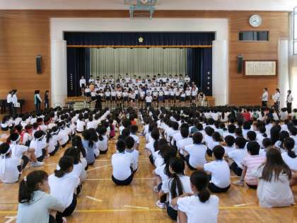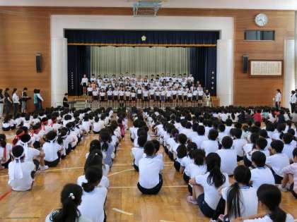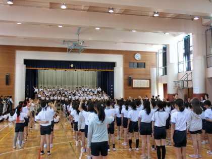 11日(木)の朝、体育館で音楽朝会をしました。今回も6年生がステージ前のひな壇に登場し、運動会の歌「ゴーゴーゴー」を歌いました。その冒頭、今年度の応援団団長が赤組、白組の順で台に立ち、自己紹介をしました。歌の中で「ゴーゴーゴー」と掛け声をかけるときに、右手を高く上げます。最後に全員で歌った時には、体育館に大きな歌声が響き渡りました。