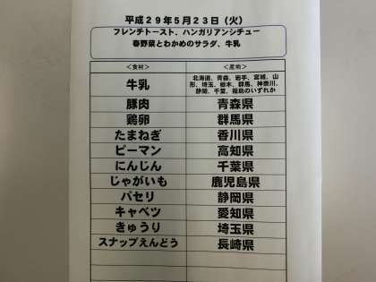 5月23日(火)の給食食材産地について