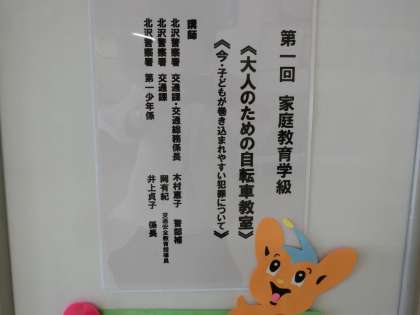 14日(水)の午前10時30分より多目的室において「第1回家庭教育学級」が開催されました。今回は、北沢警察署の方をお招きし、「大人のための自転車教室」と「今、子どもがまきこまれやすい犯罪について」の2つのご講演をいただきました。世田谷区内の自転車事故発生件数は都内ワースト1とのことです。本校からは自転車事故を起こさないように一人一人が気を付けていきたいです。
