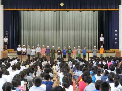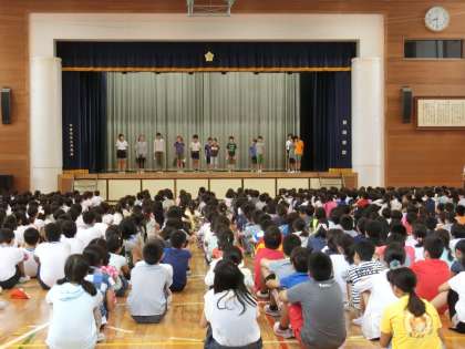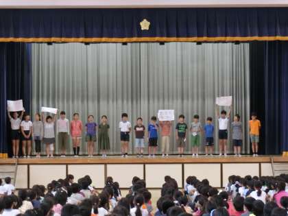 15日(木)の朝、体育館で体育朝会がありました。今回は来週から始まる「水泳」の授業で全校児童に守ってほしい約束についての説明でした。運動委員会の5・6年生が実演しながら、説明をしました。バディを組むこと、笛の合図をよく聞くこと、プールの入り方、シャワーの浴び方など一つ一つ丁寧に話していました。今年度も全員が安全に楽しく水泳の授業ができるようにしてまいります。