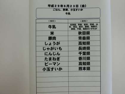 6月23日(金)の給食食材産地について