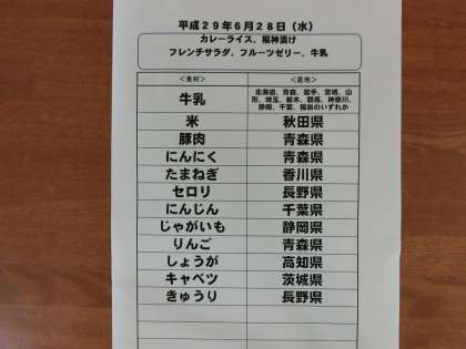 6月28日(水)の給食食材産地について