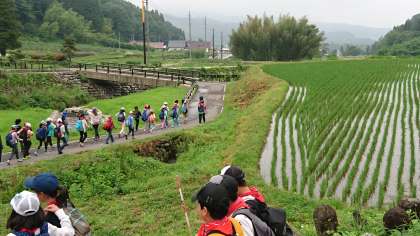子どもたちの出発を待っていたかのように、雨が上がりました。雨具をしまって村めぐりに出発です。川場村の歴史と伝統、自然や土地の利用、農林業や観光産業の様子を学んできます。