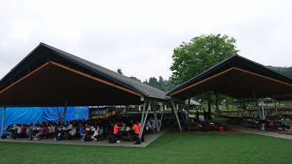 田園プラザの屋根つき広場「川場ルーフ」で、お弁当をいただきました。途中、休憩と水分補給を繰り返し、解説を聞きながらの3時間半。お腹ペコペコで到着しました。