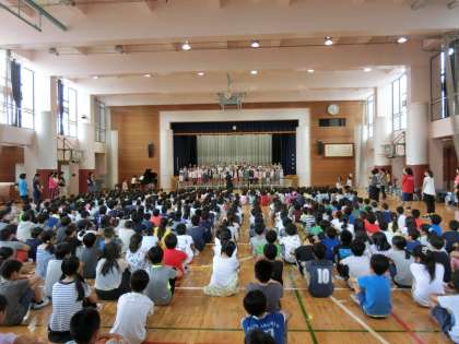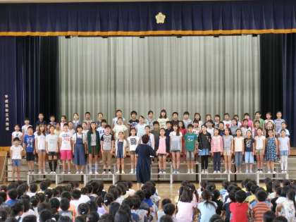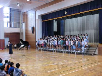 4日(火)の朝は、音楽朝会でした。今回は、合唱団の発表でした。合唱団は今月末から行われる「NHK全国学校音楽コンクール 東京都予選」に参加します。現段階での練習の成果を披露しました。歌う側も聴く側もいい緊張感をもって臨んでいました。歌い終わると大きな拍手が沸き起こりました。