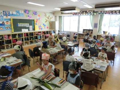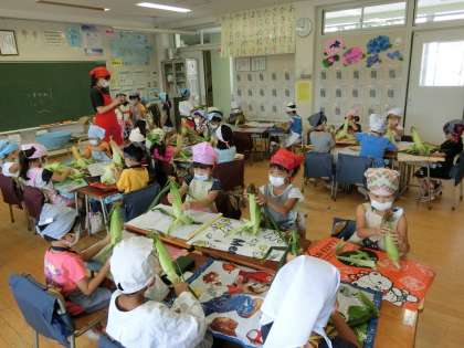 1年生 トウモロコシの皮むきに挑戦 (7/12)