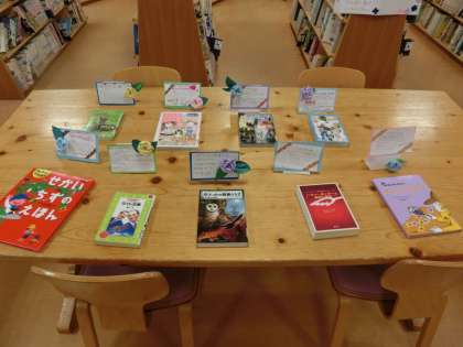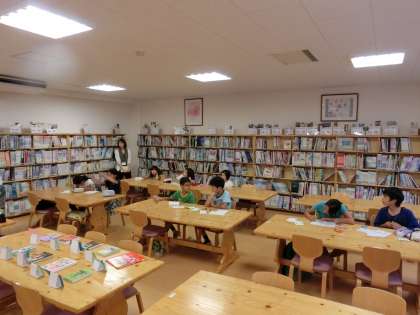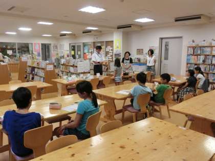 「司書体験」は90分間行われましたが、子どもたちにはあっという間だったようです。体験の最後は、「おすすめの本」を選び、その本の紹介カードを書きました。図書室に来た人の目に留まるように、カードに花を付けたり、テープを貼ったりして工夫していました。最後に、校長先生から「子ども司書修了証書」を受け取りました。この講座は明日27日(木)も行います。