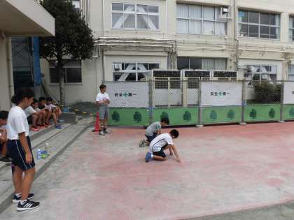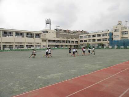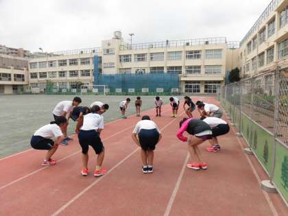 午前11時30分からは、陸上部の体験が始まりました。本校の卒業生が何人も入部していてとても頼りがいがありました。準備運動、校庭のランニングのあと、スタートダッシュの練習をしました。先輩方から細やかなアドバイスをもらっていました。
