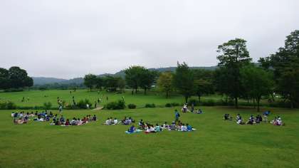 学校を出発した6年生は、だいや川公園に到着しました。曇り空ですが、緑がとてもきれいです。班ごとにお弁当をいただきます。ここは私たちが3日間過ごす日光の入り口です。いよいよ、林間学園のスタートです。