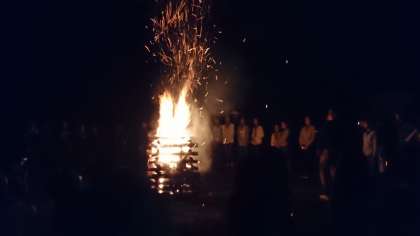 夕食をいただいている間に、辺りはすっかり暗くなりました。大きく燃える火を囲んで、キャンプファイヤーをしました。日光の思い出とともに、これからも大切にしていきたいことを、火のテーマとしました。友情の火、信頼の火、団結の火、挑戦の火。子どもたちが考えたテーマです。この火を、いつまでも心のなかに灯しておこう。そう思いながら、仲間とともにダンスやゲームをして楽しみました。