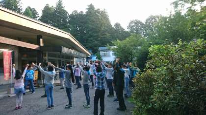二日目の朝。青空と朝の優しい陽射しのもと、朝の会をしました。ゆっくりと身体を動かし、心身をほぐしました。今日は、だいや川を遡り、奥日光に向かいます。しっかりと朝食をいただいて、力をつけて出発します。