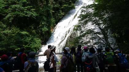 ハイキングのスタートです。湯ノ湖畔を通って湯滝に向かいました。森の中は、とても静かでした。湯ノ湖の湖面も穏やかでした。水が勢いよく流れる音が次第に大きくなり、湯滝の滝上に着きました。崖を下り、みんなで湯滝を見上げて歓声をあげました。