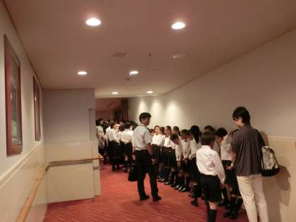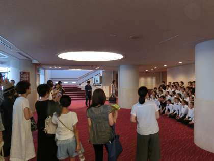 9日(水)午前10時から、「第84回 NHK全国学校音楽コンクール 東京都コンクール本選」が文京シビックホールにて開催されました。本校の合唱団は、12校中4番目に出場し、課題曲「いまだよ」と自由曲「夕暮れの歌声」の2曲を披露しました。子どもたちの美しい歌声が会場中に響き渡り、余韻が空に高くのぼっていくようでした。これまで毎日午前練習2時間、午後練習2時間をやり抜いた子どもたちにたくさんの拍手を送ります。また、これまでの練習を支えてくださった合唱団世話人の皆様、保護者の皆様に感謝申し上げます。写真は、歌い終わった直後の様子です。