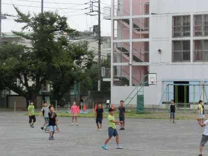 1日(金)から校庭での「朝遊び」が始まりました。本校では、7時50分から8時10分までの20分間、校庭で遊ぶことができます。7時45分に行事門が開くと走ってランドセル置き場に急ぐ子どもたちの姿があります。50分になるのが待ちきれないといった感じですが、時計を見て待つことができるようになってきました。鬼ごっこやボール投げ、ブランコやドッジボールなど、思い思いの遊びをして楽しんでいます。写真は4日(月)の様子です。
