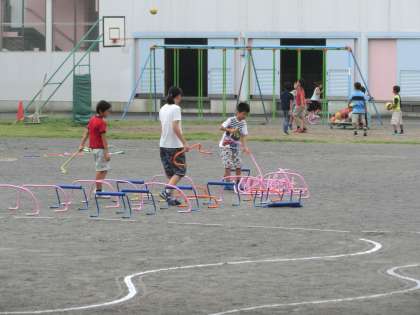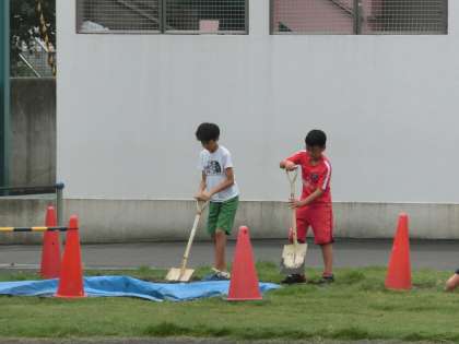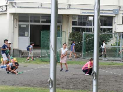 8日(金)の朝、わくわくスポーツタイムを行うために、運動委員会の5・6年生が少し早目に登校して準備をしました。朝遊びをしている子どもたちに気を付けながらミニハードルを並べたり、スコップで砂場の砂を均したり、ロープを張ったりしていました。5年生と6年生が協力し合っている姿が素晴らしかったです。