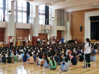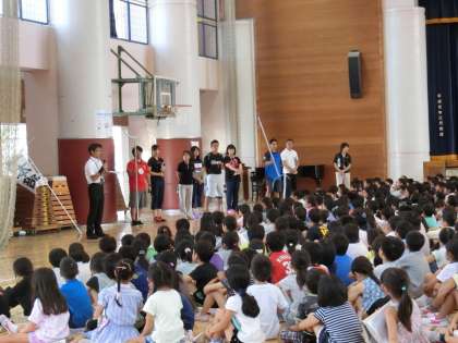 15日(金)の2時間目に避難訓練を行いました。今月の訓練は「不審者対応」訓練です。今回は、不審者が体育の授業をしている校庭に侵入したという想定で実施しました。教室にいる子どもたちは、緊急放送を聞き教室に籠城して過ごしました。主事さん、先生たちで警察官が到着するまでの間、「さすまた」を持って不審者を追い込む訓練をしました。「不審者確保」の放送で、全員が体育館に移動し人数確認をしました。校長先生のお話のあと、警察の方にもお話しいただき、その中で「遊びや習い事に行くときにも防犯ブザーを持って行ってください。」と強調されていました。